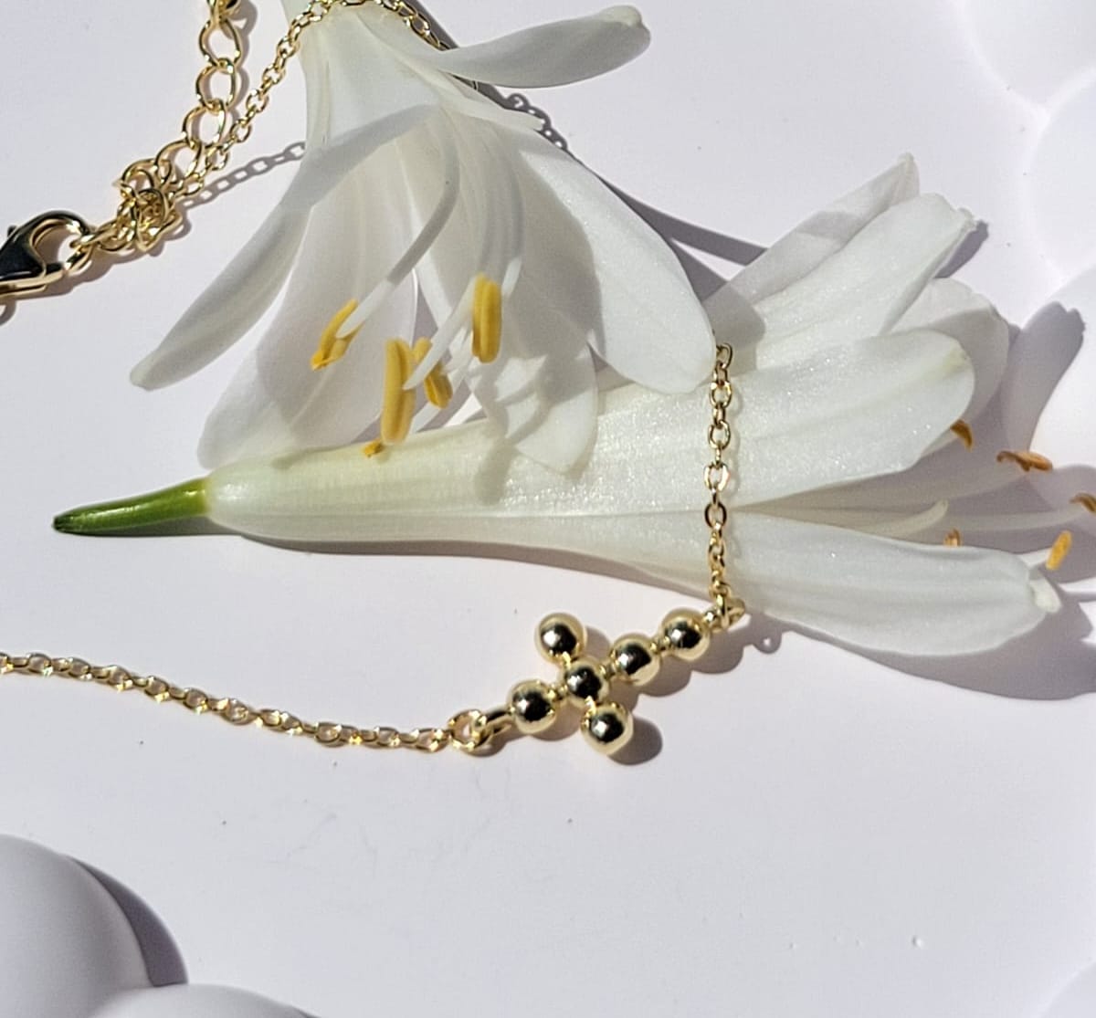 Brazalete delicado en Plata 925 con baño dorado, con cruz de esferas minimalista. Un accesorio moderno con un mensaje de fe sutil y elegante.