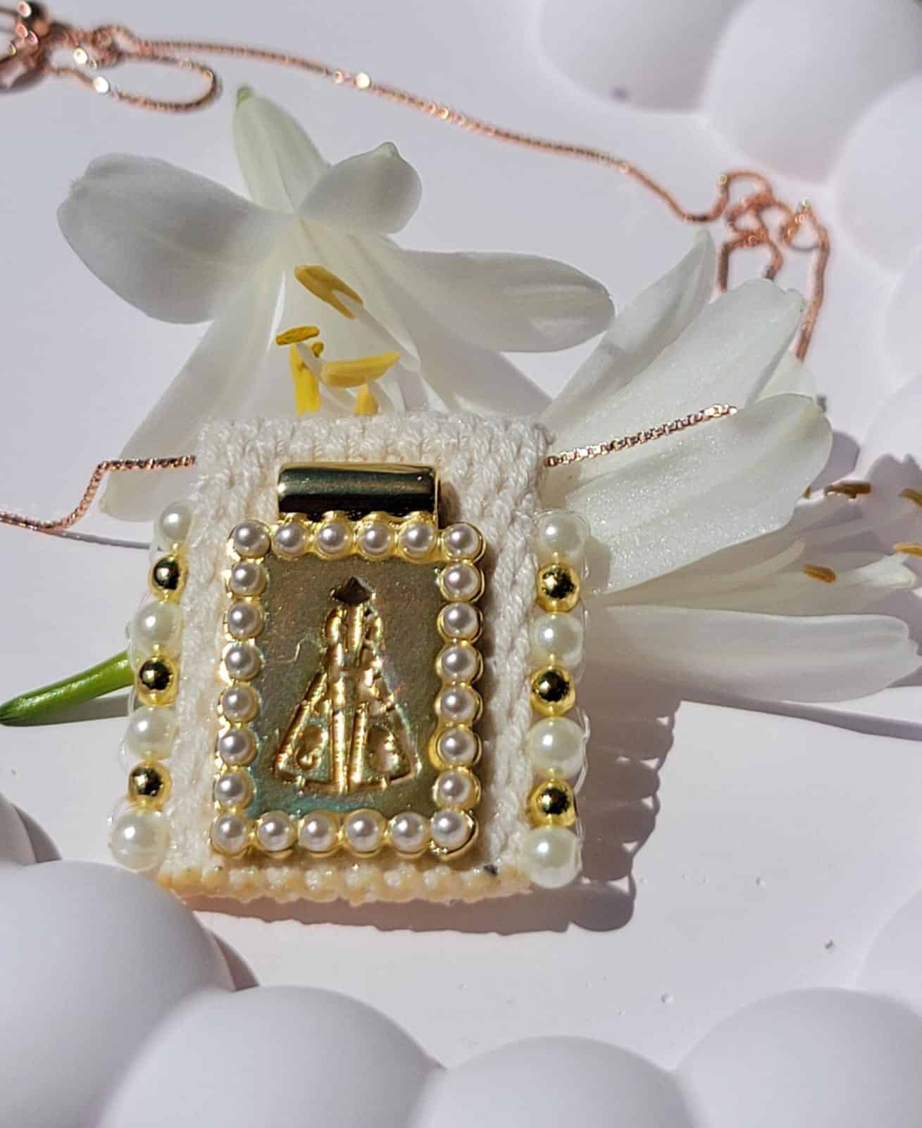 Dije: Tejido a mano con perlas y pieza religiosa dorada