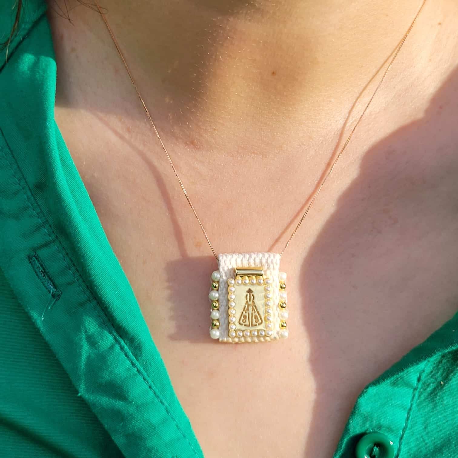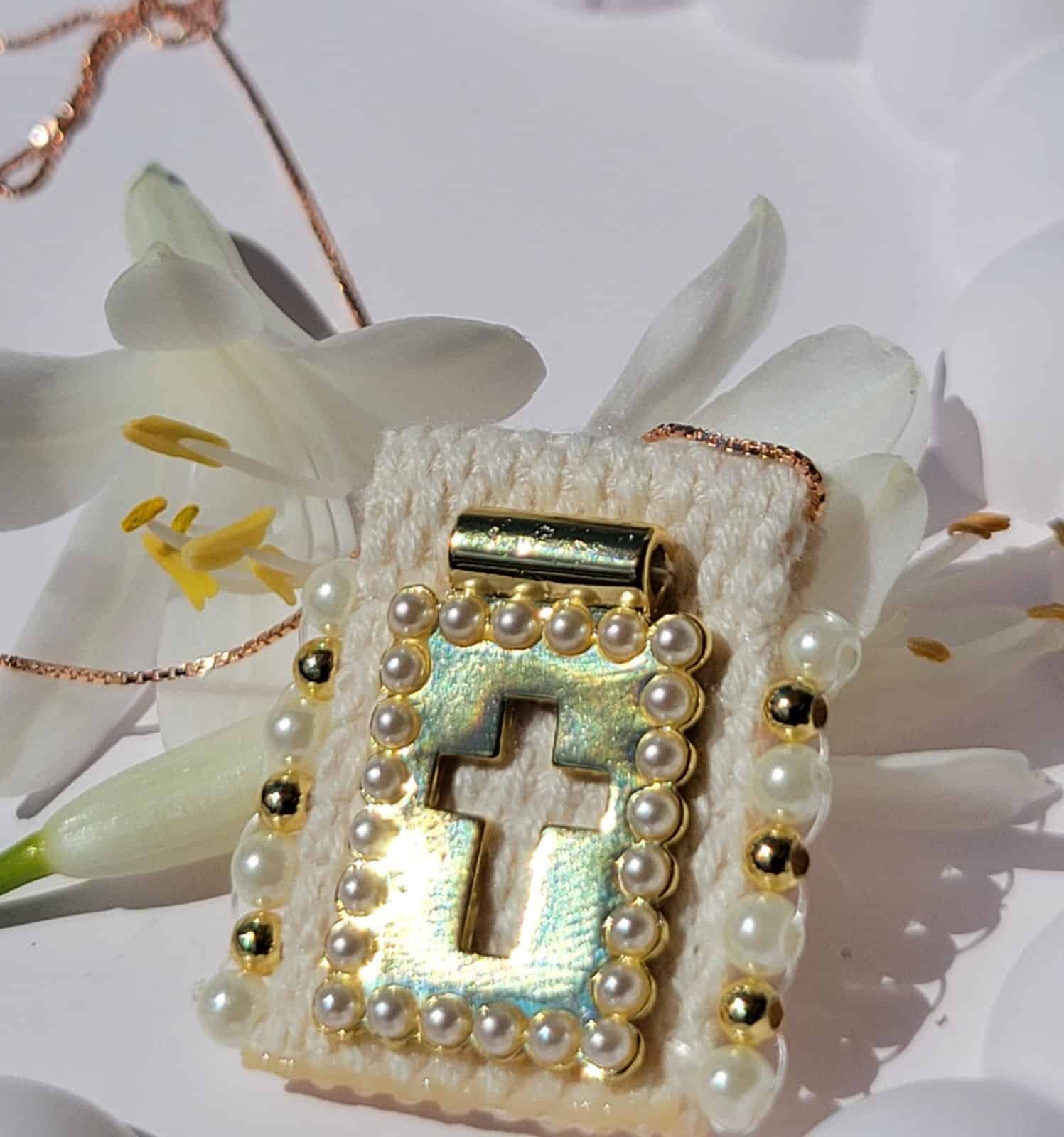 El centro del diseño es un dije hecho a mano en tejido artesanal, embellecido con delicadas perlas enmarcando una figura religiosa metálica (cruz, Virgen o Sagrado Corazón, según el modelo). Cada pieza está creada con cuidado y detalle, fusionando espiritualidad y arte textil.