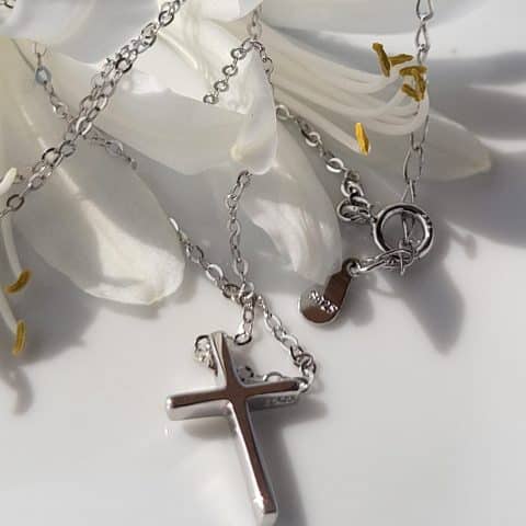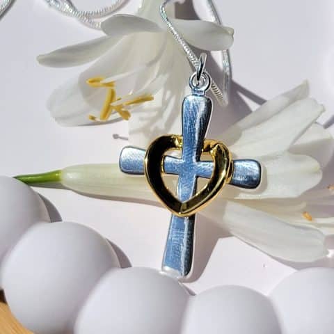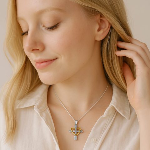 A su lado, una cruz en tono plata completa el simbolismo espiritual de esta joya. Su cadena es ajustable, lo que permite usarlo a diferentes alturas, ideal tanto para uso diario como para ocasiones especiales.