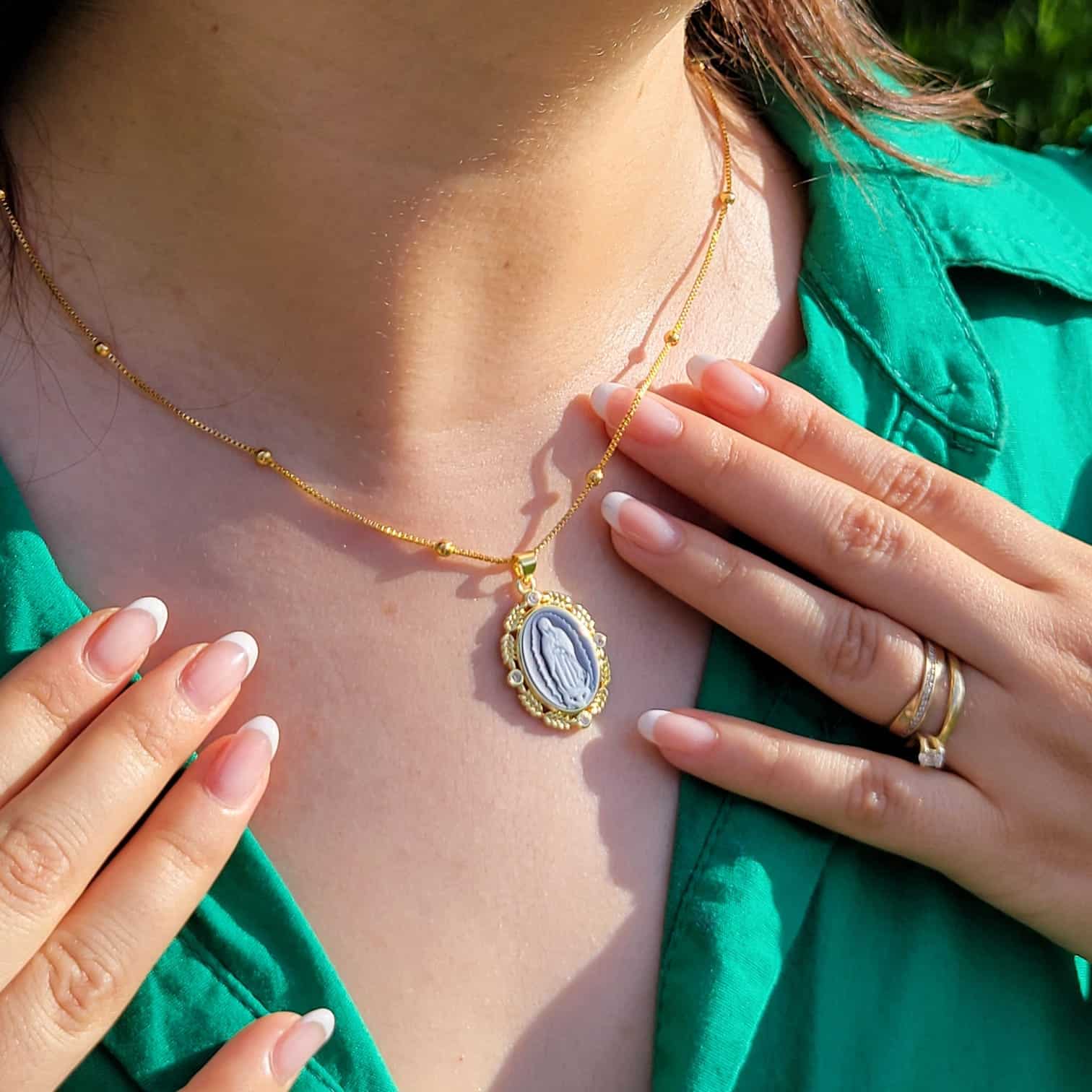 Elegante dije de la Virgen de Guadalupe tallado en piedra ágata azul, enmarcado en un diseño con baño de oro de 18k y detalles brillantes.