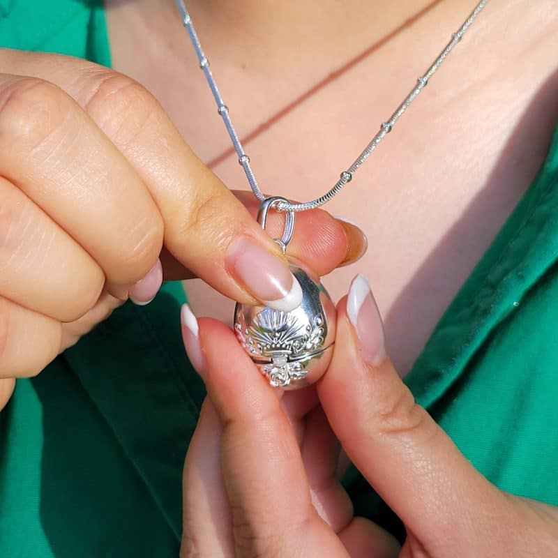 Es una joya que no solo representa fe, sino también sofisticación y buen gusto. Su diseño inspirado en los famosos huevos Fabergé combina herencia artística europea con espiritualidad católica. Ideal como regalo significativo o como un accesorio devocional de uso diario.