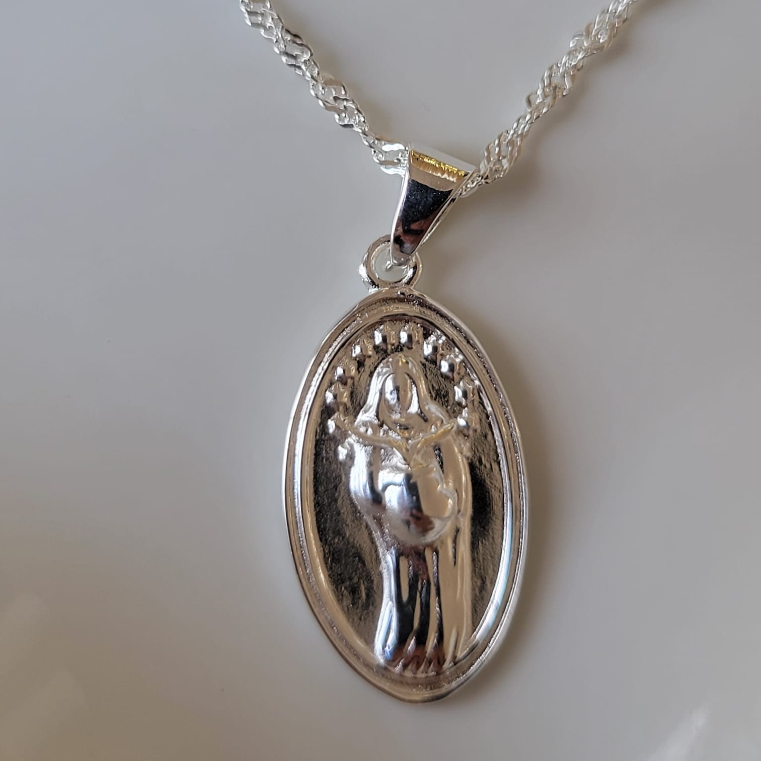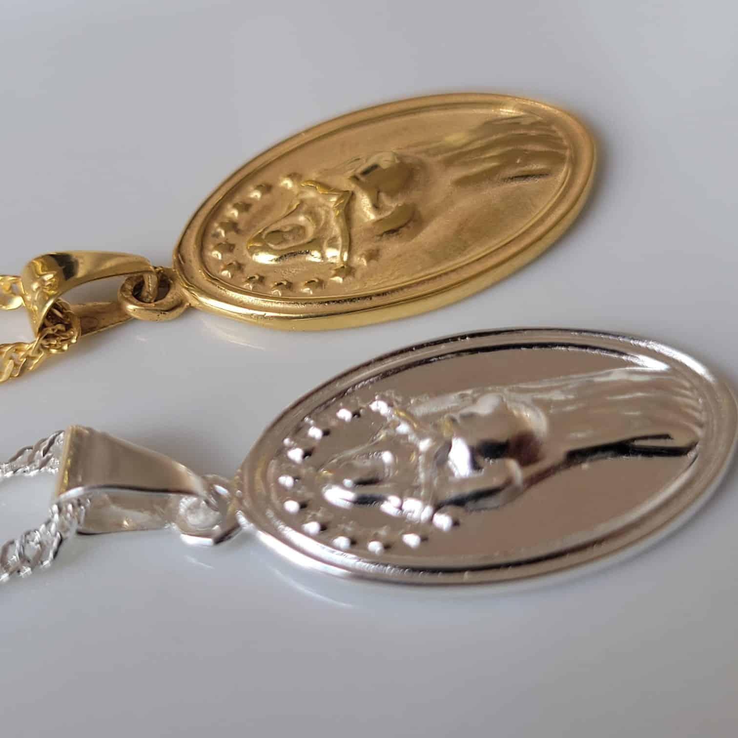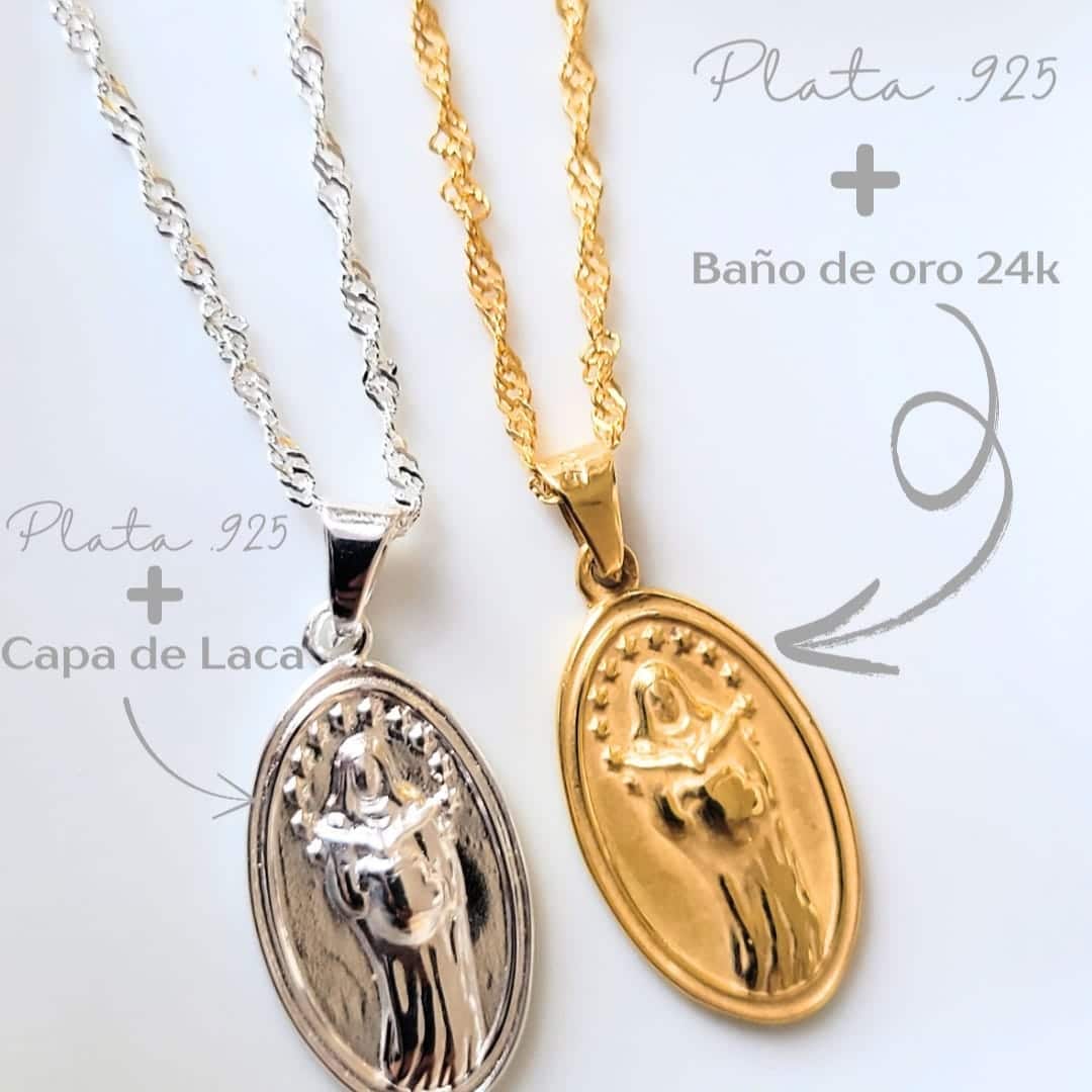 Fabricada en Plata Ley 925, esta medalla combina calidad, brillo y durabilidad, mientras que el acabado en laca ayuda a preservar su resplandor y protegerla del desgaste diario. Ideal para portar en un collar, como recuerdo de embarazo o como regalo significativo en baby showers, bautizos o celebraciones marianas.