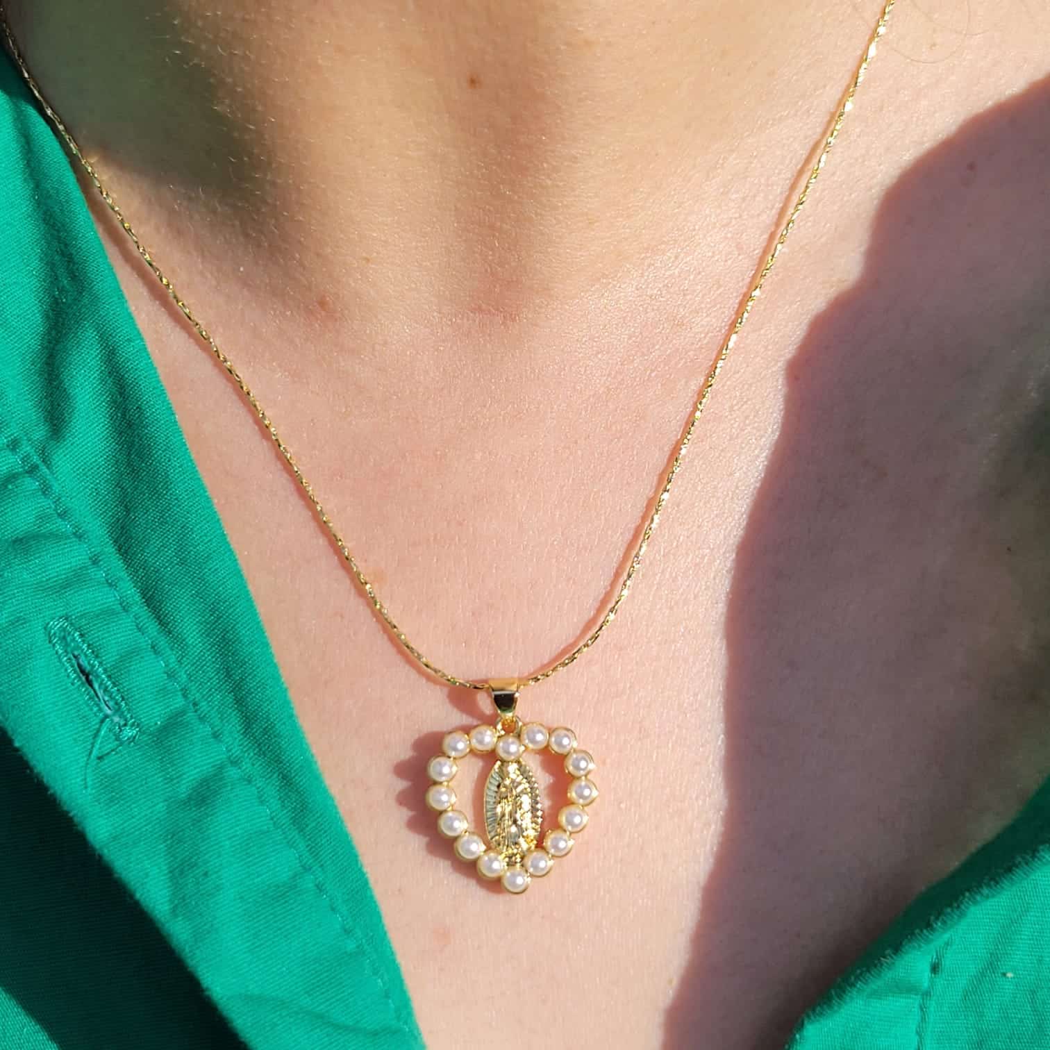 Collar con dije en forma de corazón decorado con perlas sintéticas, en cuyo centro se encuentra la figura de la Virgen de Guadalupe. Bañado en oro de 18 quilates, ideal para mujeres de fe.