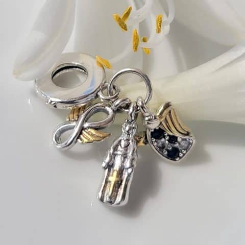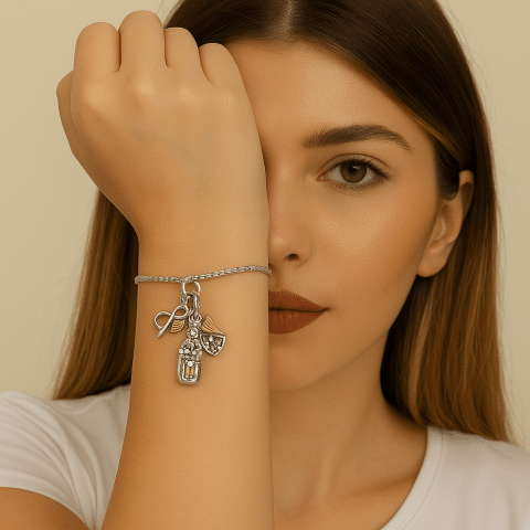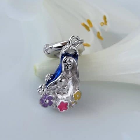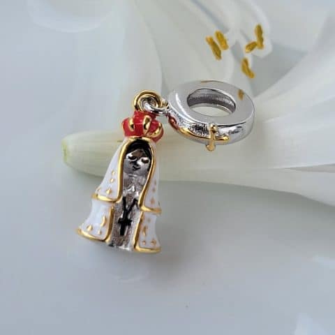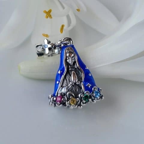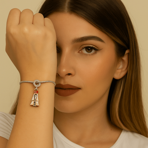 La pieza está cuidadosamente elaborada para mantener el estilo tradicional, con su inconfundible corona y postura orante. Compatible con pulseras tipo Pandora, este charm es perfecto para quienes desean llevar un símbolo de fe y protección mariana a diario.