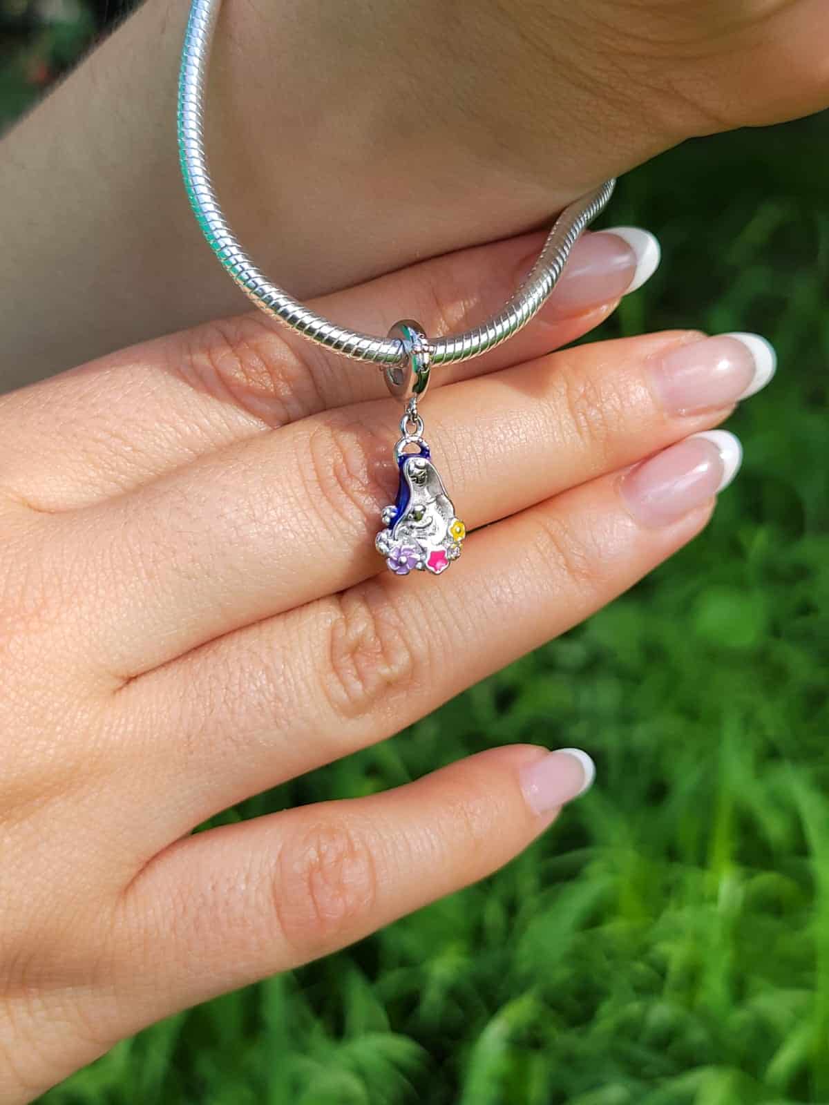 Es una pieza compatible con pulseras estilo Pandora, ideal también para dijes de collar o como regalo especial cargado de devoción.