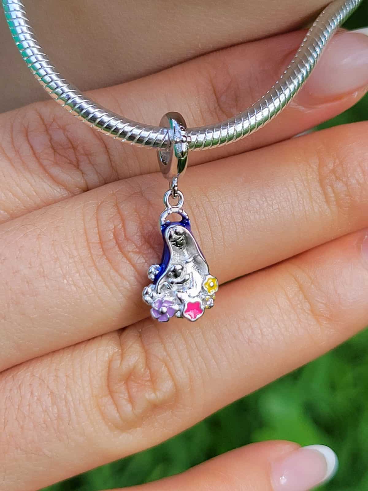 Charm en Plata 925 esmaltado a mano, que representa a la Virgen del Carmen con el Niño Jesús en brazos, rodeados de flores. Compatible con pulseras tipo Pandora.